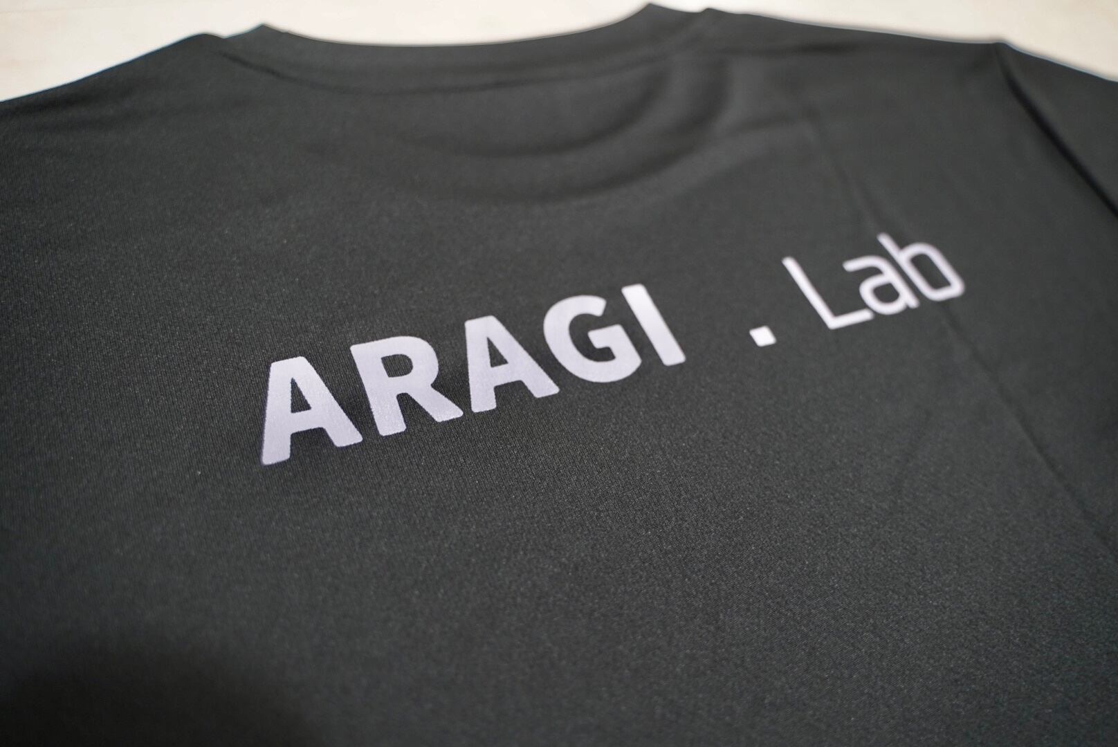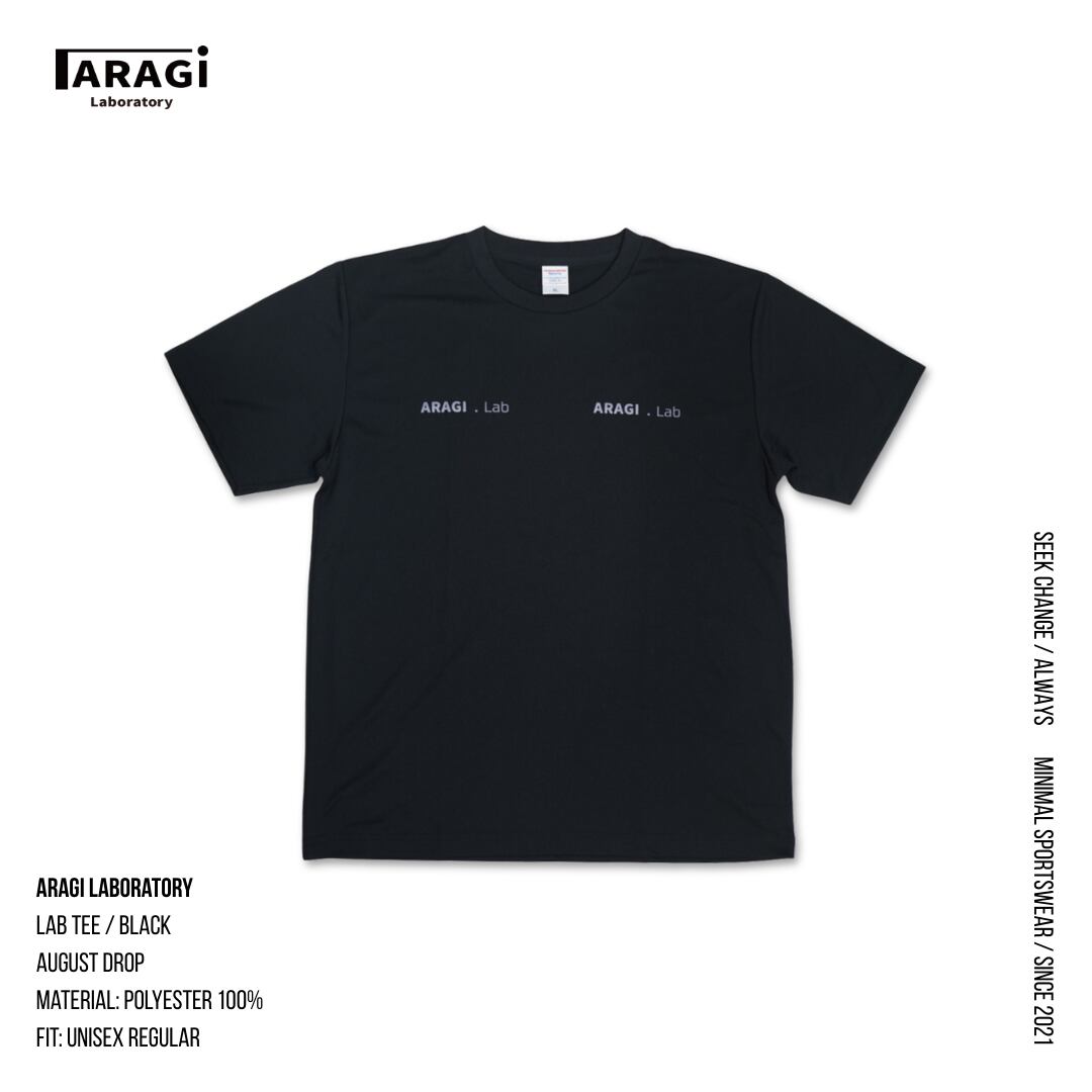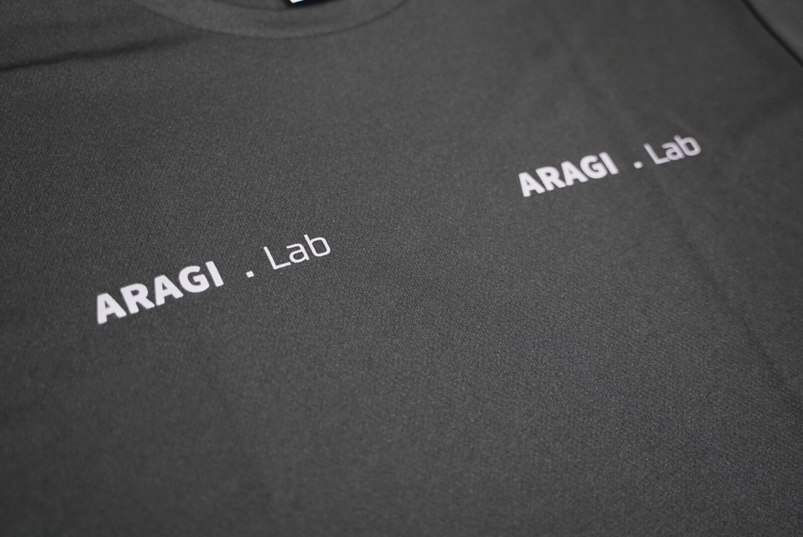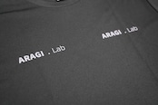 黒の面と余白で組んだミニマルT。胸に「ARAGI . Lab」をさりげなく、背面は大ぶりのレタリングで存在だけを残す。主張は控えめ、印象は強く。