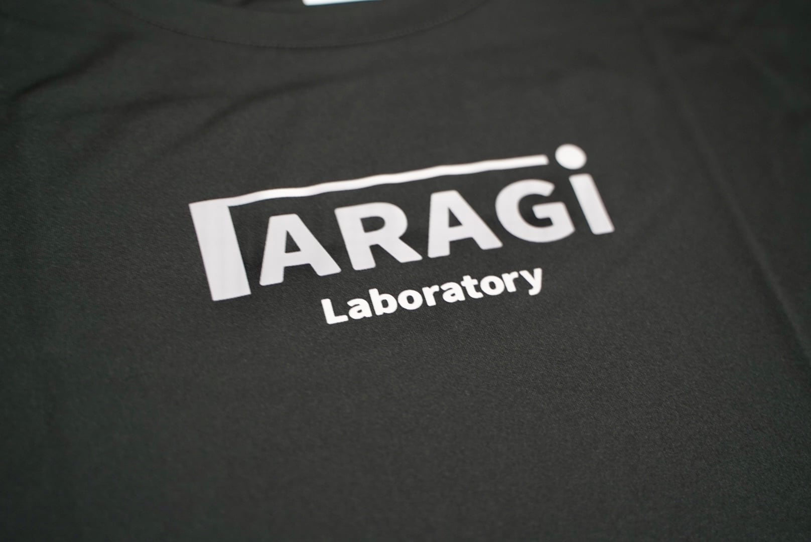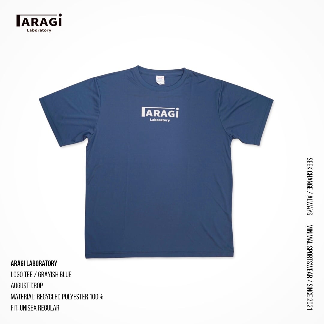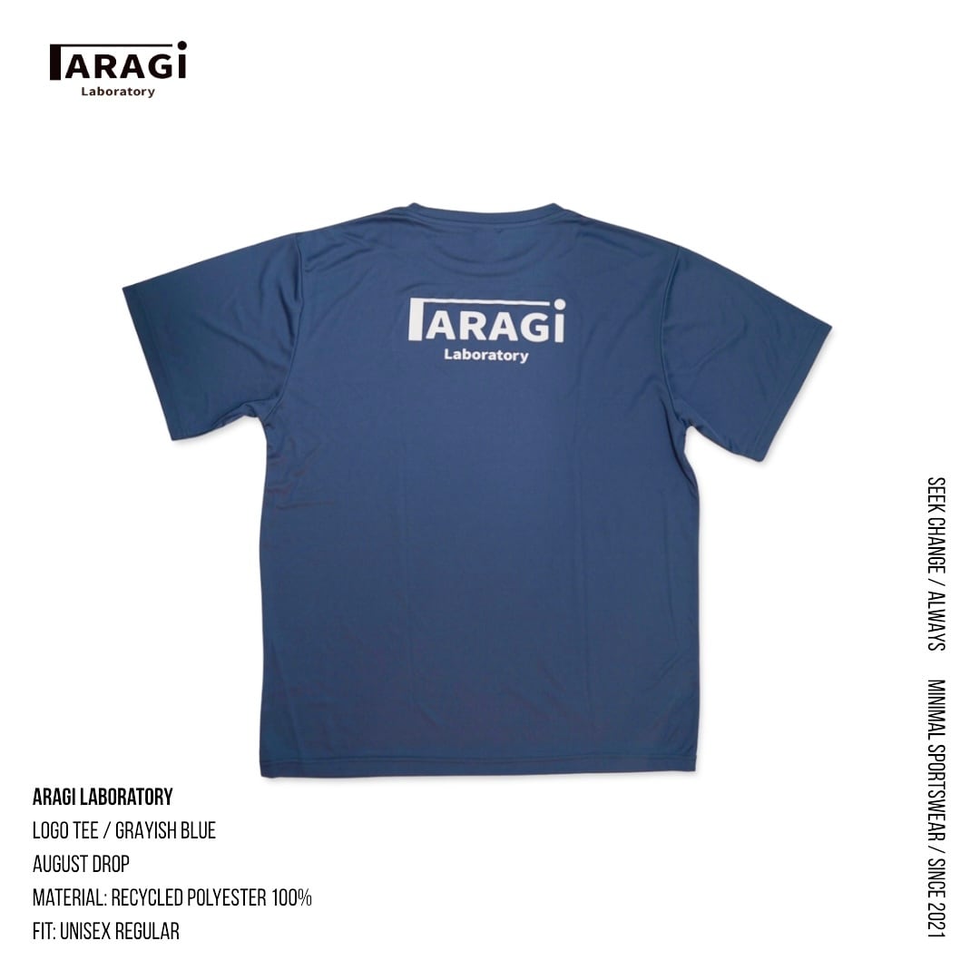 黒に映えるダスティなGrayish Blueのボディに、ワンポイントのARAGIロゴ。背面は大きめのレタリングで“存在だけ”を残す、ミニマルな1枚です。